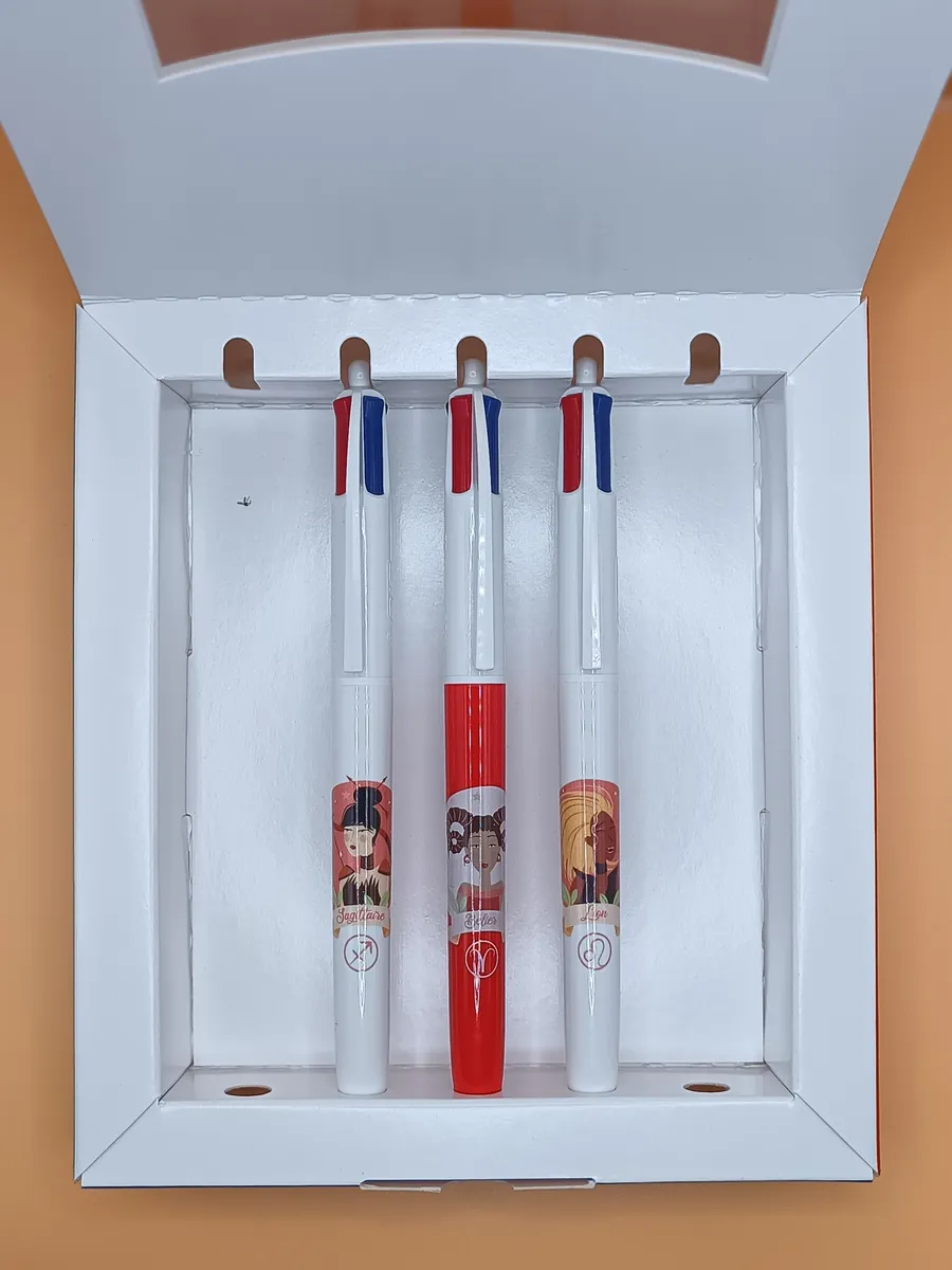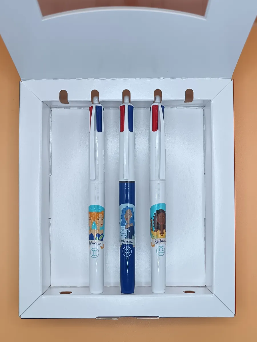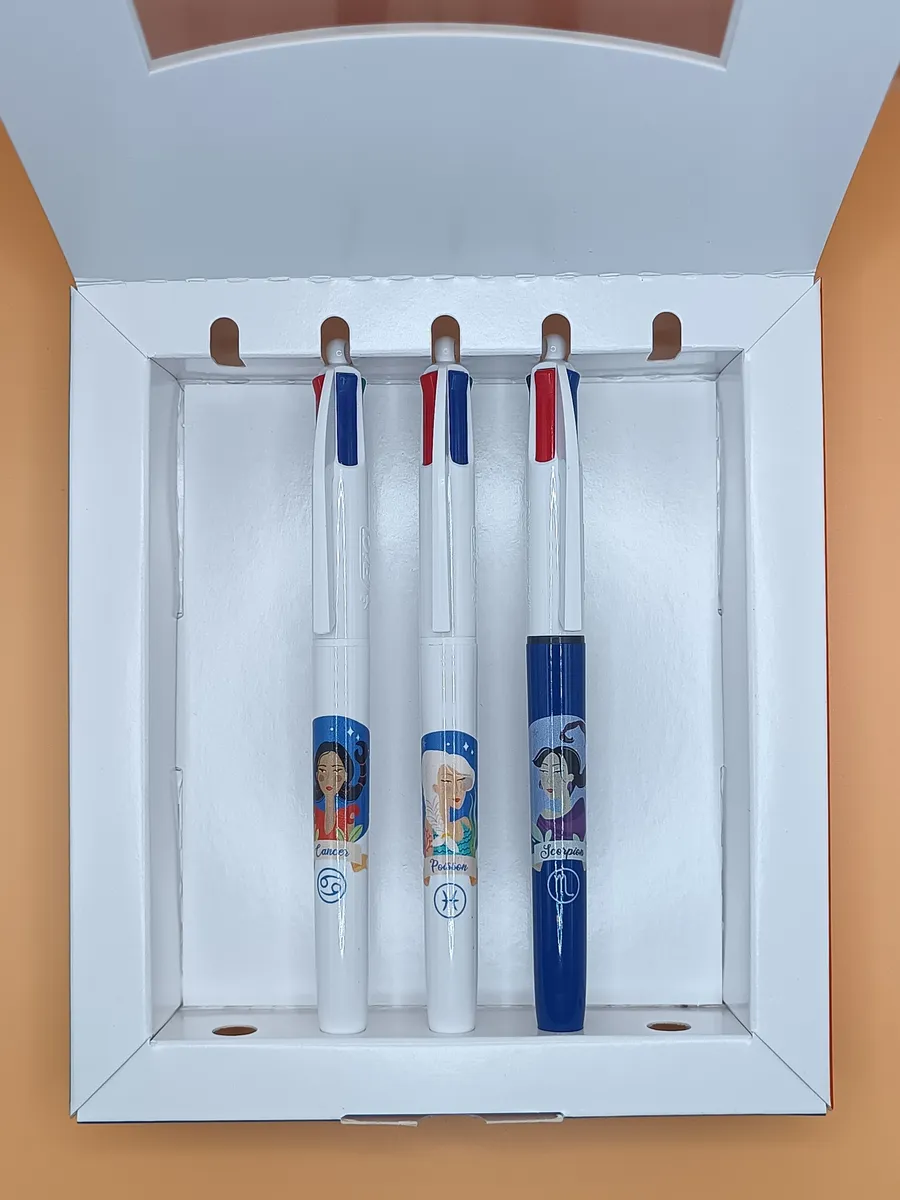 ♈ Chaque signe du zodiaque est incarné par un portrait féminin stylisé aux illustrations douces et colorées, classés selon les quatre éléments — eau, feu, terre, air — comme si BIC avait engagé une astrologue à plein temps. Que vous soyez Taureau têtu avec un tube vert ou Scorpion mystérieux avec un tube marine, votre destin est écrit… en quatre couleurs.