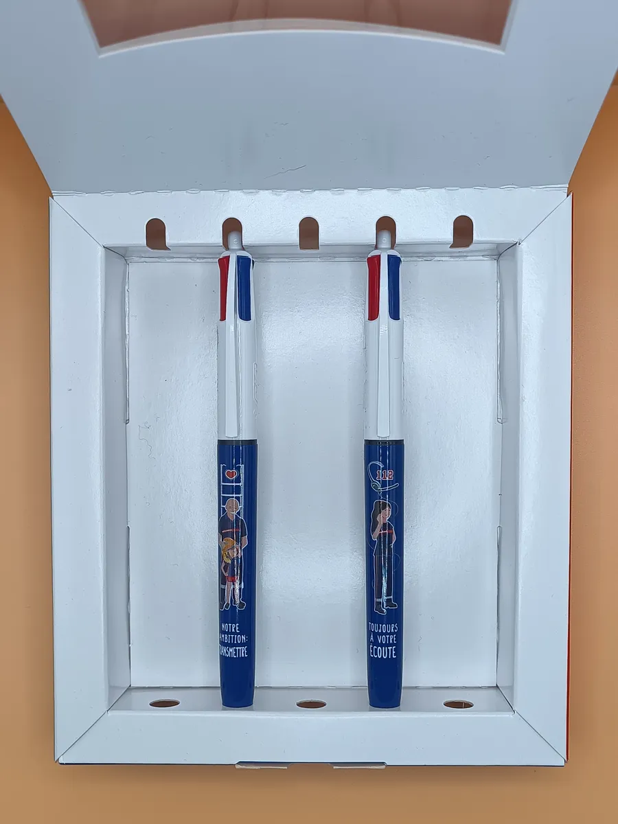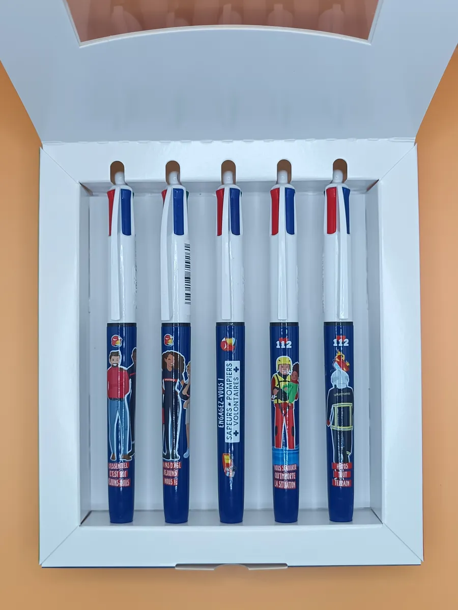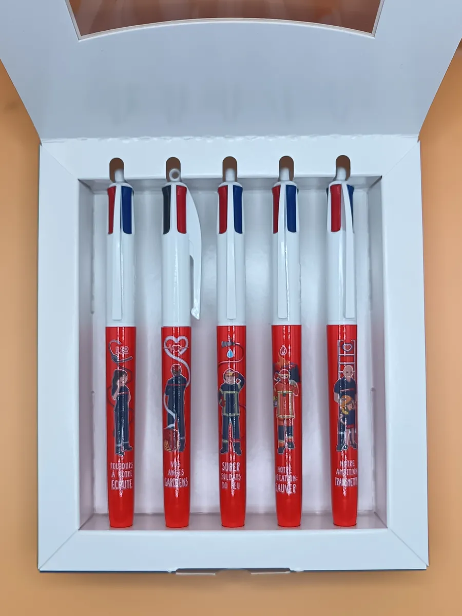 🚒 BIC 4 Couleurs mettant l'accent sur les vocations des pompiers au quotidien : l'écoute, la sauvegarde, et l'ambition de transmettre ses valeurs aux jeunes générations — une partie des bénéfices reversée au Fonds d'Entraide de la FNSPF. (BIC) Illustrations colorées : bénévole civil, pompière, « Engagez-vous ! Sapeurs-Pompiers Volontaires », pompier en intervention, pompier avec camion. La version rouge, plus vive et visible que la version bleue.